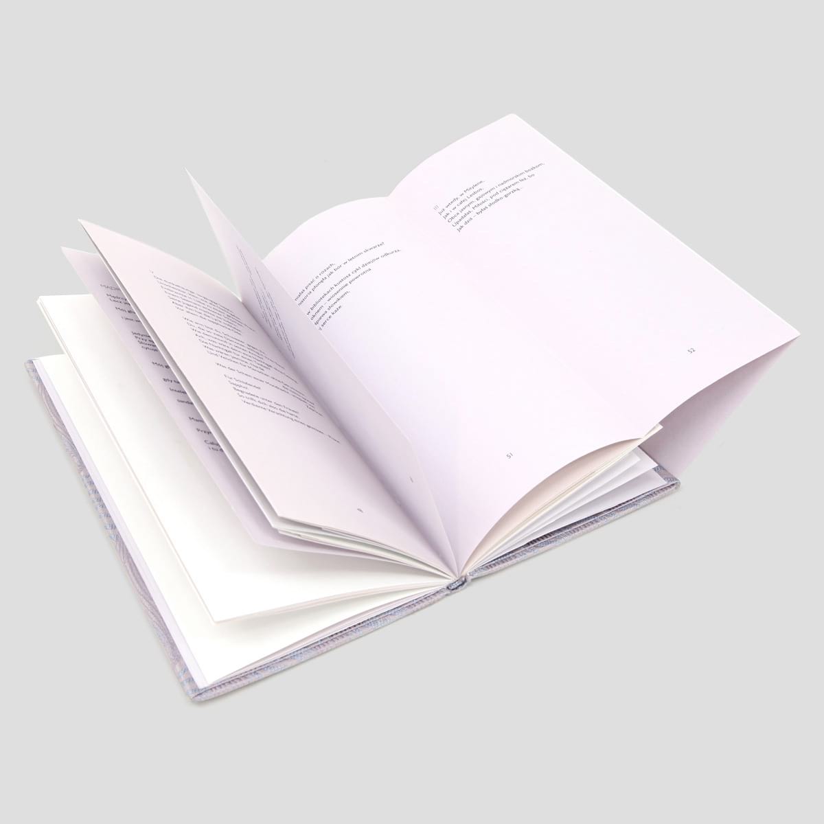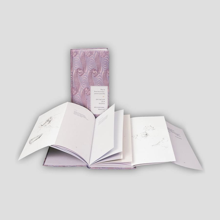 Stronice książki nasączone zapachem ukochanych przez poetkę fiołków mają różne szerokości. Są wielokrotnie składane longiny. Nie można tego tomiku przewertować pośpiesznie.