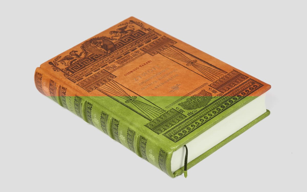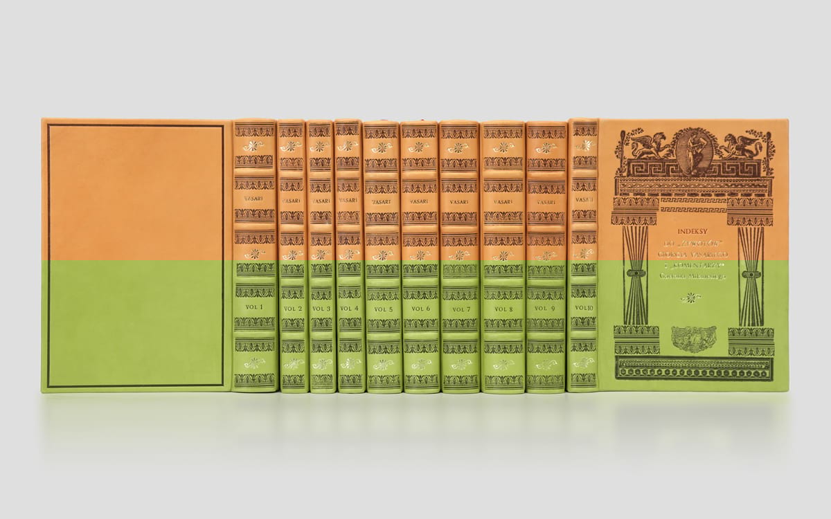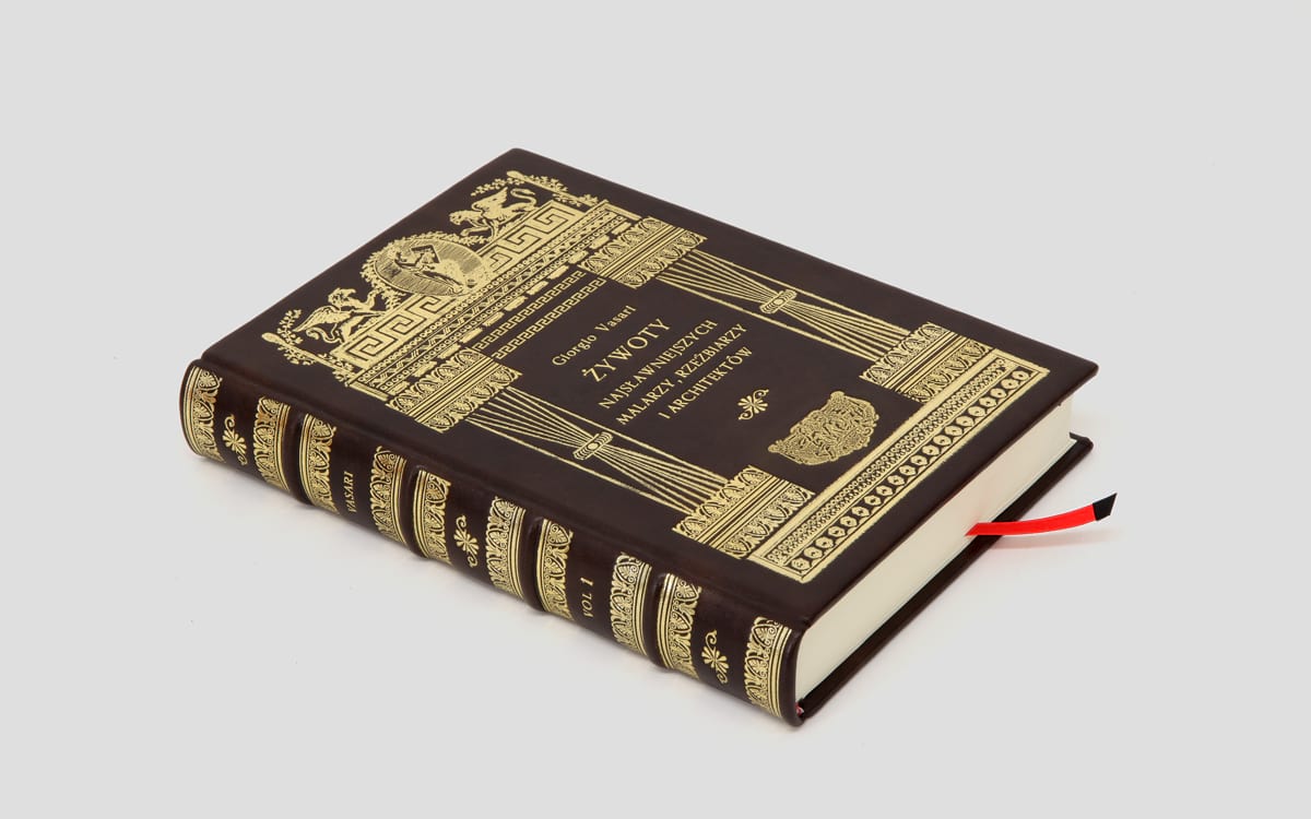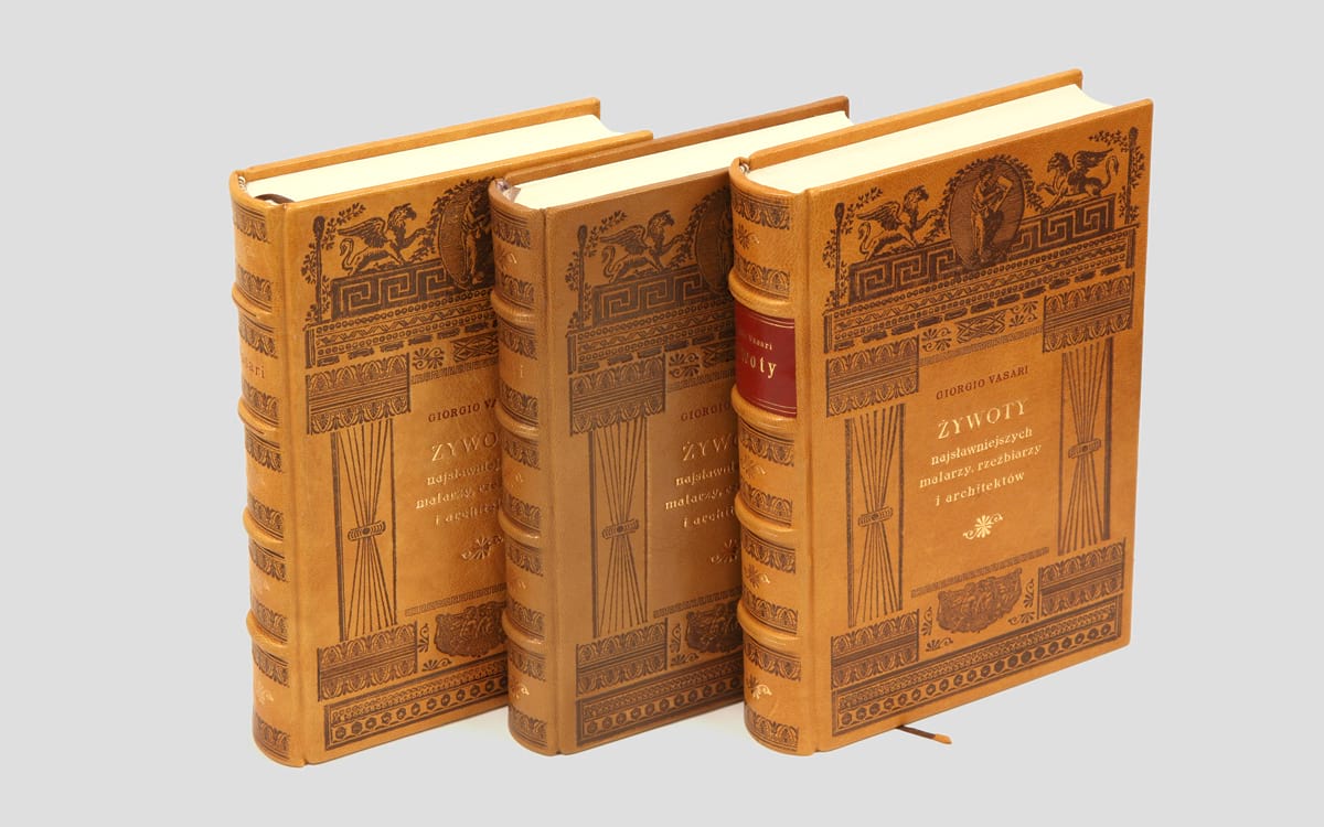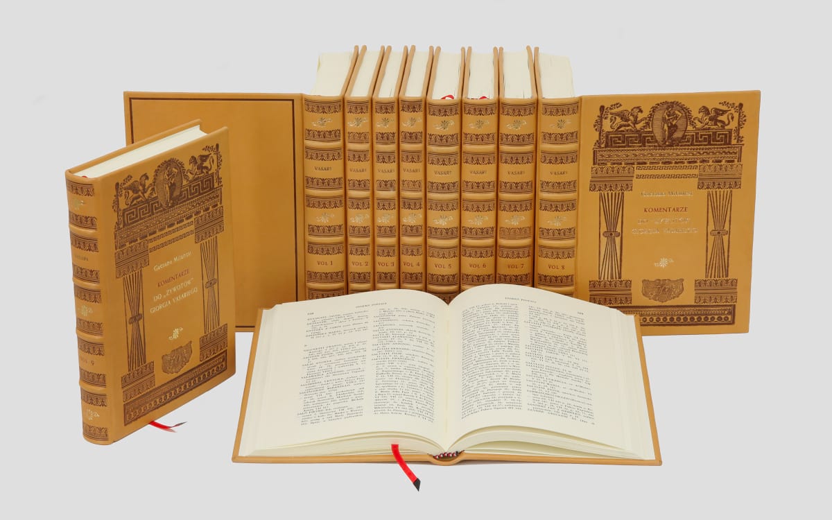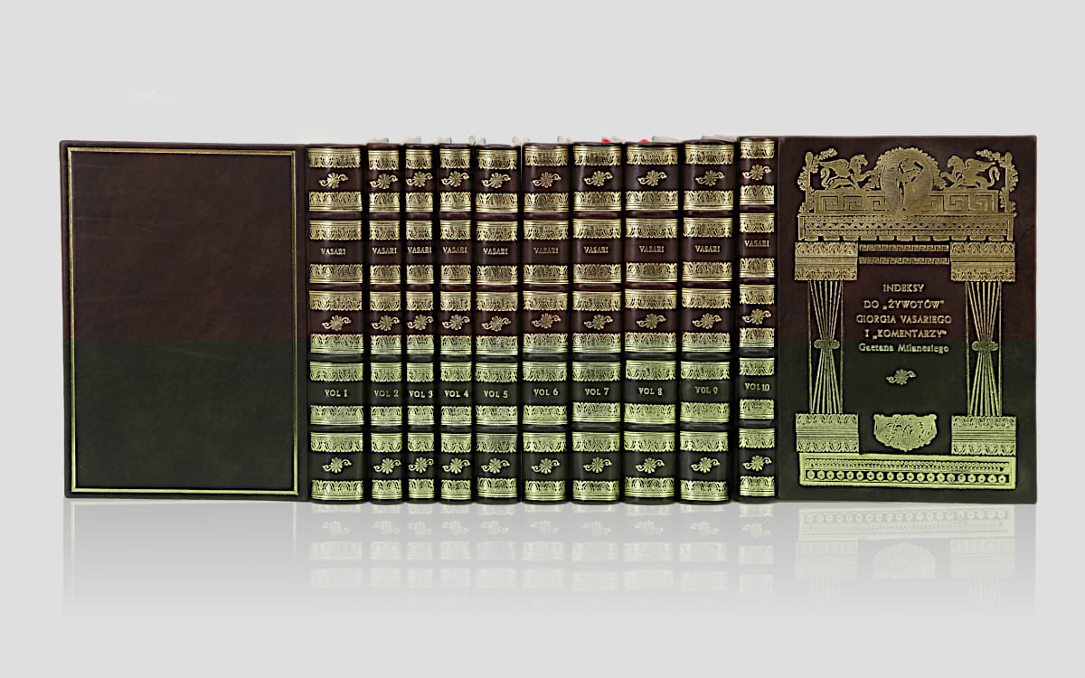 Przepiękny 10 tomowy zbiór dzieł Giorgio Vasariego został oprawiony w skórę i wydrukowany na papierze artystycznym. Każda z książek oprawiana jest ręcznie, w związku z tym każdy z egzemplarzy może się nieznacznie różnić od tego, który został przedstawiony na zdjęciach.